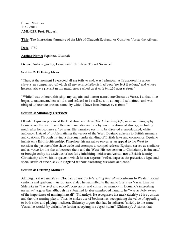 Olaudah Equiano or Gustavus Vassa. The narrative is argued to represent a variety of styles such as a slavery narrative travel narrative and spiritual narrative. The book describes Equianos time spent in enslavement and documents his attempts at.
